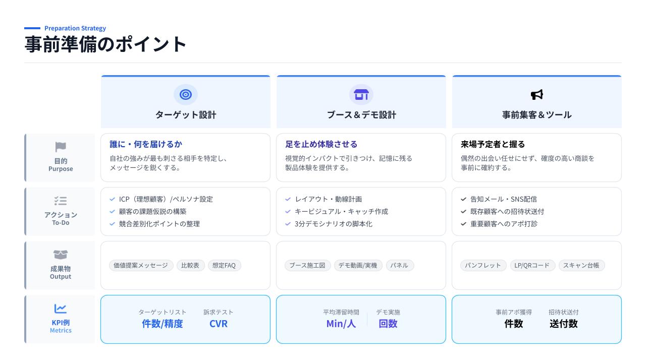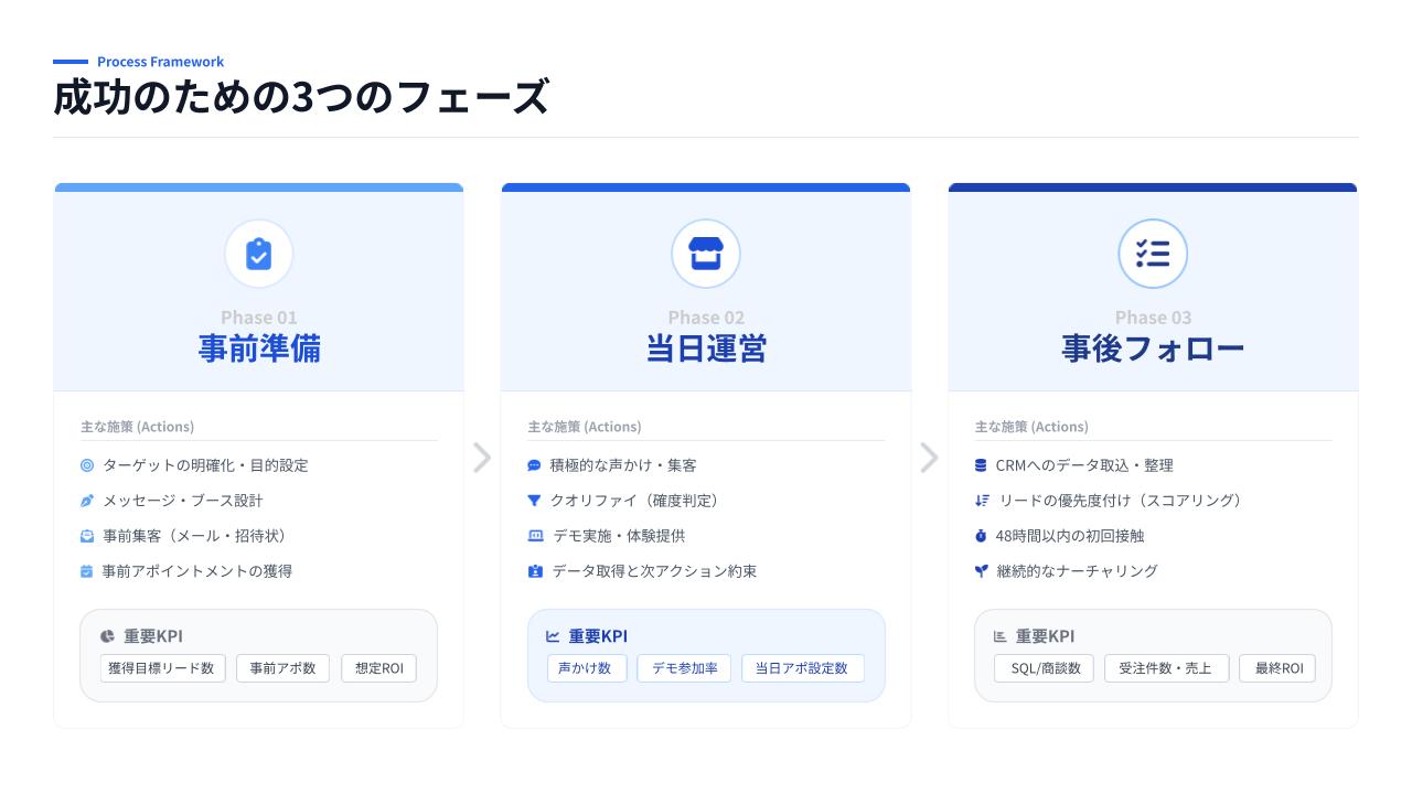 事前準備の徹底から会期中の効果的な集客と質の高い名刺交換、そして着実に成果へと繋げる事後のフォローアップまで、一貫した戦略的アプローチが不可欠です。