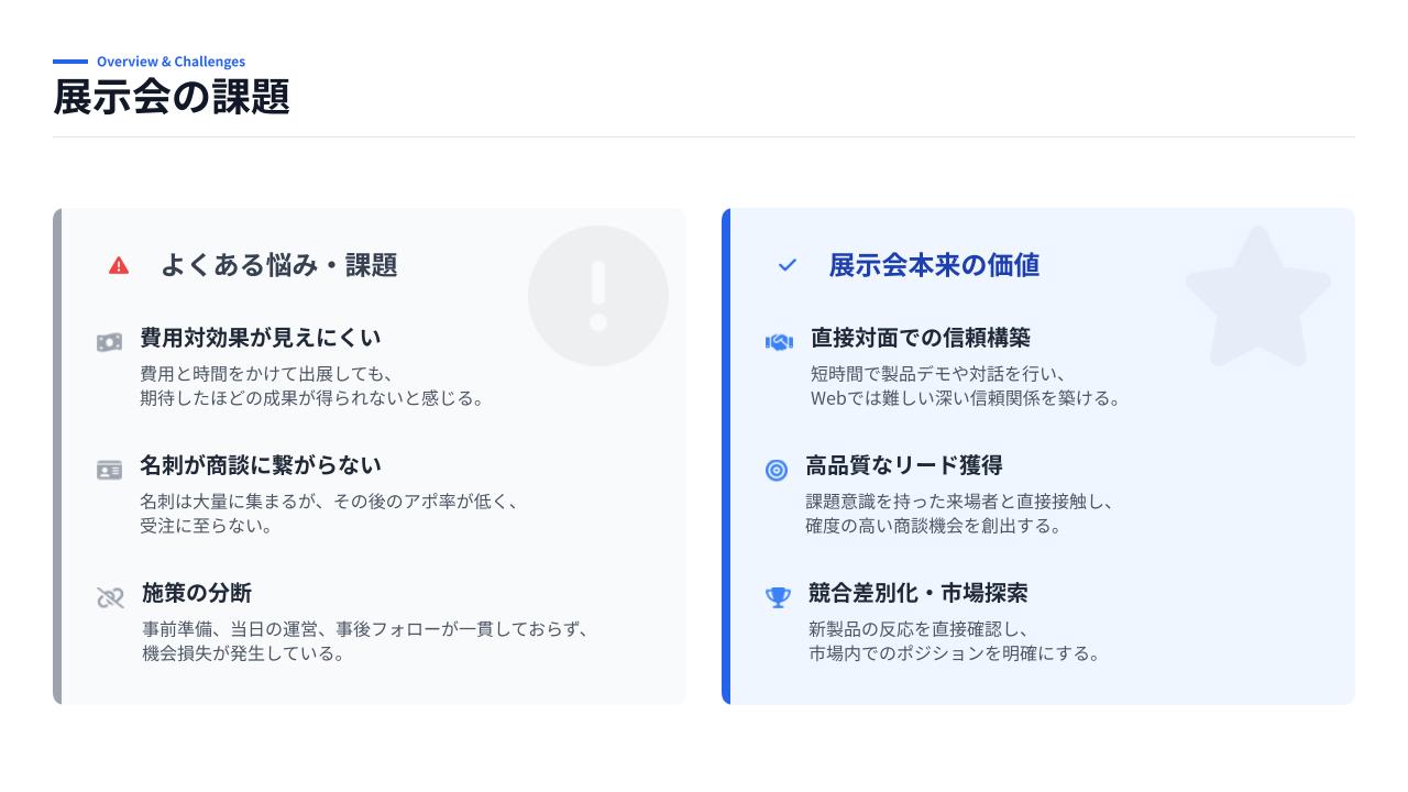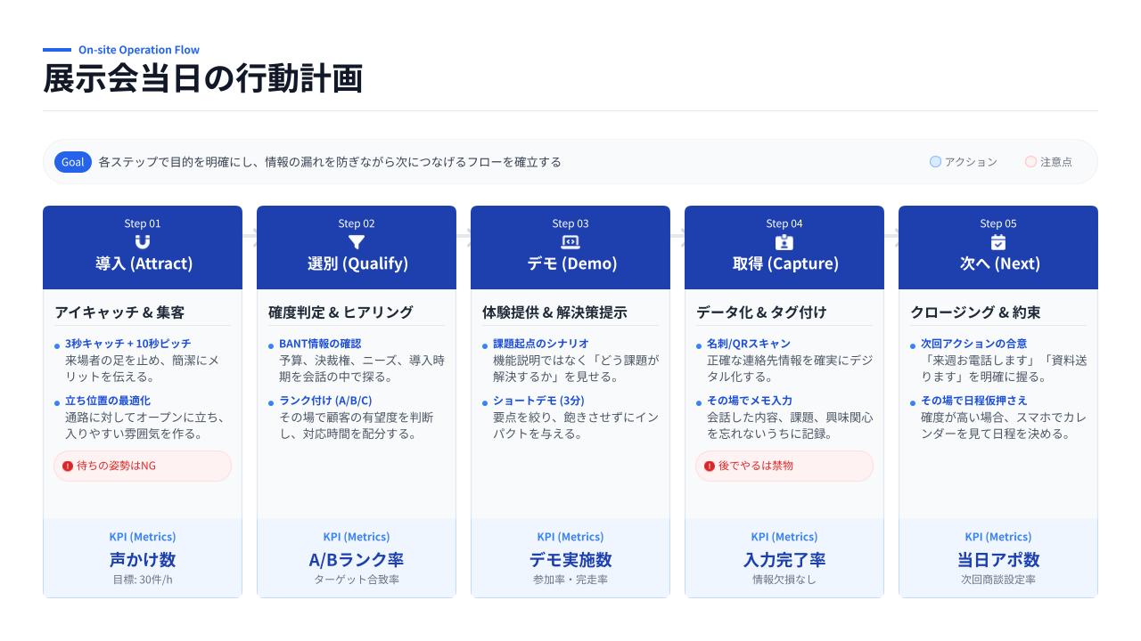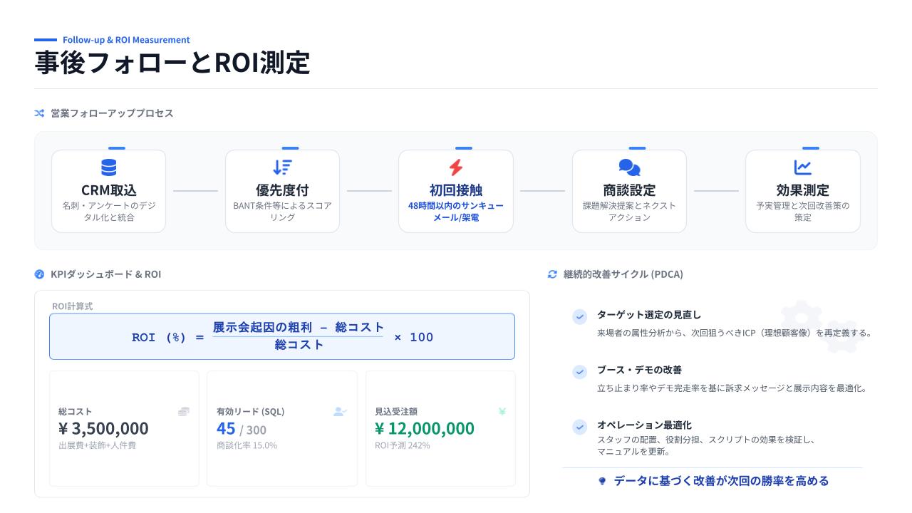 展示会は単なる接点のスタート地点であり、その後の営業戦略が成否を分ける鍵となります。